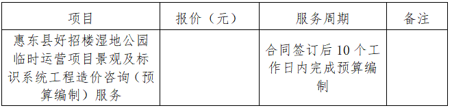 項目名稱:惠東縣好招樓濕地公園臨時運營項目景觀及標識系統(tǒng)工程造價咨詢(預(yù)算編制)服務(wù)